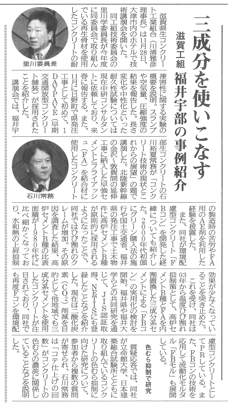 福井県や福井大学らとの共同研究を通じて、JIS認証取得、NETISにも登録したことなどを紹介した。現在は二酸化炭素(CO2)削減を目的として他地域でも三成分系セメントを使用したコンクリートが注目されており、同社でも再度Fコンを環境配慮型コンクリートとしてPRしている。また、FBコンの技術を応用して流動化モルタル「FBモル」も展開している。
